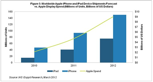 據(jù)IHS iSuppli公司的研究報告,由于預(yù)計iPhone和iPad產(chǎn)品出貨量今年大幅增長,蘋果2012年可能在這兩款產(chǎn)品的顯示器面板上面支出90億美元,進一步確保其在平板電腦和手機市場中的主導(dǎo)地位。
