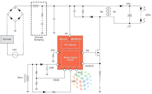 同樣,在LED照明市場的調光方面,Marvell最新推出的高度集成的88EM8183 LED驅動器IC采用了獨特的混合信號架構和先進的調光控制技術,提供高品質光輸出且調光性能可與白熾燈媲美??善交貙崿F(xiàn)低至1% LED電流的深度調光,相比之下,同類LED驅動器解決方案一般僅能實現(xiàn)10%至20%的調光。以這種幅度調光,人眼感覺不到光強有很大的變化,因此 88EM8183顯著提高了性能。