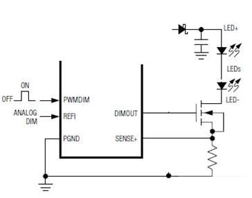然后用一個PWM信號加到MOS管的柵極,以快速地開關這串LED。從而實現(xiàn)調光。也有不少恒流芯片本身就帶一個PWM的接口,可以直接接受PWM信號,再輸出控制MOS開關管。