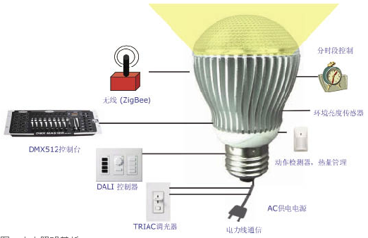 未來(lái)照明革新市場(chǎng)潛力巨大,如圖1所示。分時(shí)段控制是指在不同時(shí)間段有不同的亮度。環(huán)境亮度傳感器可以靈活應(yīng)對(duì)燈具所處環(huán)境的亮度,比如天陰的時(shí)候天黑的比平常早,那么路燈就會(huì)提前打開(kāi)。動(dòng)作傳感檢測(cè)器是指夜晚的時(shí)候如果燈具周?chē)鸁o(wú)人活動(dòng)時(shí),會(huì)調(diào)低亮度,當(dāng)檢測(cè)到有人活動(dòng)時(shí),就會(huì)調(diào)高亮度。另外,現(xiàn)代照明需要有多重通信方式,除了無(wú)線(xiàn)方式以外,DALI或DMX512等先進(jìn)的照明專(zhuān)用通信協(xié)議使得燈具的管理更加便捷,電力線(xiàn)載波通信(PLC)也是近年來(lái)備受關(guān)注的方向。
