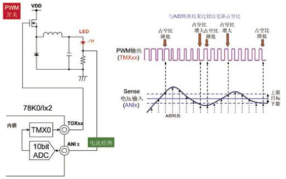 第二種是通過(guò)A/D轉(zhuǎn)換器進(jìn)行反饋控制,使用A/D轉(zhuǎn)換器檢測(cè)LED電流,通過(guò)改變PWM輸出占空比實(shí)現(xiàn)恒流控制。通過(guò)改變A/D轉(zhuǎn)換的目標(biāo)值實(shí)現(xiàn)各通道的獨(dú)立調(diào)光,如圖3所示。