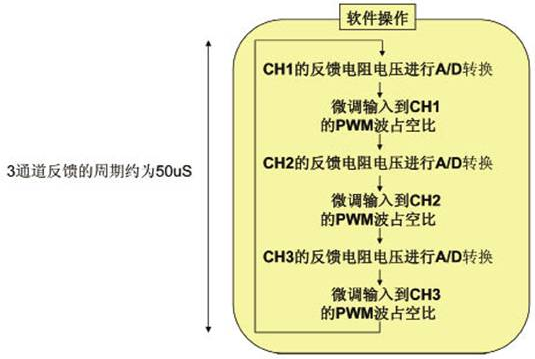 LED恒流控制操作流程圖如圖4所示,如圖,有3通道的LED需要控制,是A/D轉(zhuǎn)換→PWM輸出的微調(diào)的重復(fù)操作。軟件操作過(guò)程是對(duì)CH1的反饋電阻電壓進(jìn)行A/D轉(zhuǎn)換,微調(diào)輸入到CH1的PWM波占空比,然后對(duì)通道2和通道3進(jìn)行同樣操作,重復(fù)上述流程即可。三個(gè)通道的A/D轉(zhuǎn)換和檢測(cè)調(diào)整的整個(gè)周期約為50μs。