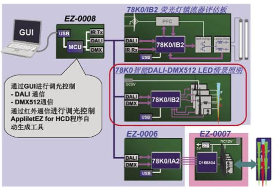 瑞薩電子的照明參考方案由3部分組成,可通過(guò)PC端GUI進(jìn)行調(diào)光控制,PC和通信板通過(guò)USB線(xiàn)連接,情景照明板和通信板之間可以由紅外、DALI及DMX512三種方式實(shí)現(xiàn),在瑞薩電子的照明參考方案中,可以使用AppliletEZ for HCD程序自動(dòng)生成工具,實(shí)現(xiàn)照明控制程序的涉及、編譯和燒寫(xiě)。照明參考方案如圖5所示。