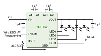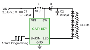 在電感升壓型拓撲結構方面,安森美半導體提供采用PWM和/或單線式調(diào)光方式的不同產(chǎn)品,適合在低電壓便攜式設備背光和閃光應用中驅動白光LED。這些產(chǎn)品包括:輸出電流為20 mA的CAT37、CAT32、CAT4238、CAT4252、CAT4253、CAT4157、CAT4158和CAT4258,輸出電流為40 mA的CAT4137和NCP5005,輸出電流為50 mA的CAT4139,以及更大輸出電流的CAT4240(250 mA)、NCP1422(800 mA)和CAT4131(1.5 A/0.3 A)等。