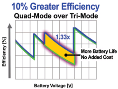 大多數(shù)電荷泵LED驅動器可提供對應于輸出電壓與輸入電壓比的三種操作模式:1倍、1.5倍和2倍;而四模架構增加了1.33倍的第四種操作模式,不需要額外的電容和電感。它比三模式電荷泵效率提高了10%以上。