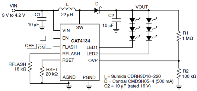 以CAT4134為例,這是一款大功率電感升壓型雙通道驅動轉換器,提供2路匹配的LED電流。輸出電流級別通過2個電阻之一RSET或RFLASH來控制。當FLASH輸入引腳為低(電影模式),電阻RFLASH設置LED電流。每個通道驅動2或3個白色串聯(lián)LED,并提供1個可調(diào)節(jié)電流以控制其亮度。支持輸入電壓低至3V,使得器件適合于鋰離子電池的應用。
