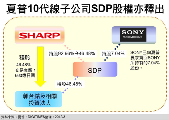 除此之外,黃銘章說(shuō)明,夏普以10代TFT LCD產(chǎn)線(2,880mm×3,130mm)為主體的子公司Sharp Display Products (SDP),其46.48%股權(quán)也將出售給鴻海創(chuàng)辦人及董事長(zhǎng)郭臺(tái)銘及相關(guān)投資人,屆時(shí)夏普及鴻海相關(guān)投資人將各持有SDP 46.48%股權(quán),剩余7.04%股權(quán)原由Sony持有,但3月28日Sony已要求夏普買(mǎi)回此一部分股份。