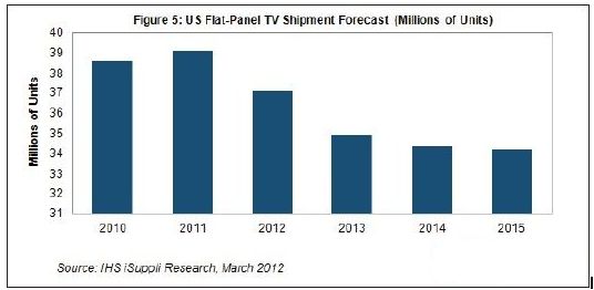 據(jù)IHS iSuppli公司的美國電視市場追蹤報告,2012年美國市場的平板電視出貨量預(yù)計降到3710萬臺,比2011年的3910萬臺減少5%。去年出貨量較2010年的3860萬臺微增1%。