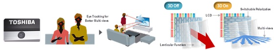 正當(dāng)快門式與偏光式技術(shù)相互廝殺的同時,Toshiba已悄悄地發(fā)布裸眼式3D電視,將3D電視的技術(shù)競爭提升到另一個新的層次。Toshiba除了以12寸和20寸等級來試探市場外,還在2011 CES上展示56寸和65寸的裸眼式3D電視。雖然除了Toshiba外,SONY和LG也分別展示裸眼技術(shù)的3D電視,但是僅有Toshiba宣示將于2011年生產(chǎn)大尺寸的裸眼式3D電視,特別是2011年底發(fā)布的55X3。