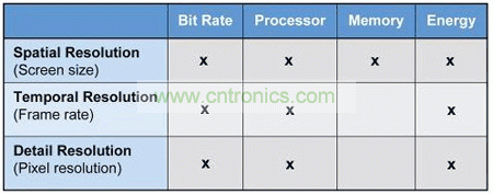 表 1 給出了不同視頻編碼參數(shù)對解碼設(shè)備所需資源選擇的大致影響。該表專門對采用運動補償與離散余弦變換 (DCT) 技術(shù)實現(xiàn)視頻壓縮的基于塊的視頻編解碼器進行了分析。