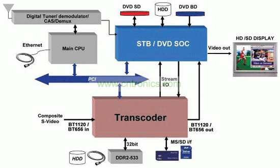 轉(zhuǎn)碼硬件必須與整個 STB 系統(tǒng)中的其他系統(tǒng)進行良好交互,其中包括數(shù)字調(diào)諧器、解多路復(fù)用器 (Demuxer) 和解調(diào)器、DDR2 存儲器、PCI 總線,以及向 STB SoC 傳輸音/視頻的高帶寬接口。圖 2 給出了常見的架構(gòu)示意圖,但這不一定是一般性架構(gòu)。