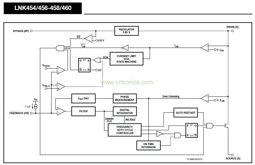 LinkSwitch-PL在一個(gè)器件上集成了一個(gè)高壓功率MOSFET開(kāi)關(guān)及一個(gè)電源控制器。該IC器件提供單級(jí)功率因數(shù)校正和LED電流控制。LinkSwitch-PL控制器包括一個(gè)振蕩器、反饋(檢測(cè)及邏輯)電路、5.85 V穩(wěn)壓器、遲滯過(guò)熱保護(hù)、頻率抖動(dòng)、逐周期限流、環(huán)路補(bǔ)償電路、自動(dòng)重啟動(dòng)、開(kāi)關(guān)導(dǎo)通時(shí)間延長(zhǎng)、功率因數(shù)以及恒流控制電路。