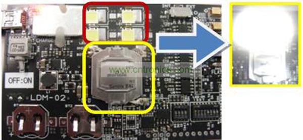 圖2中EDLC作為輔助電源,顯示了8A的電流流入LED時(shí)的數(shù)據(jù)。得出的結(jié)果是超過(guò)了1,000lux的亮度。