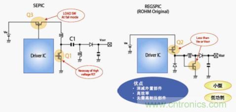 面對車載特有的電池電壓波動和多樣化的LED燈數(shù),以升壓方式和降壓方式很難進行LED的閃爍控制與平臺設(shè)計,要滿足市場所要求的高可靠性與縮短開發(fā)周期之間的平衡實屬不易。因此,為了不依賴電池電壓、可以始終穩(wěn)定供給DC/DC轉(zhuǎn)換器輸出電壓,ROHM采用了一種稱為“REGSPIC結(jié)構(gòu)”的獨有升降壓方式。下面介紹REGSPIC結(jié)構(gòu)與一般的升降壓方式所用的SEPIC結(jié)構(gòu)相比所具有兩個優(yōu)點。