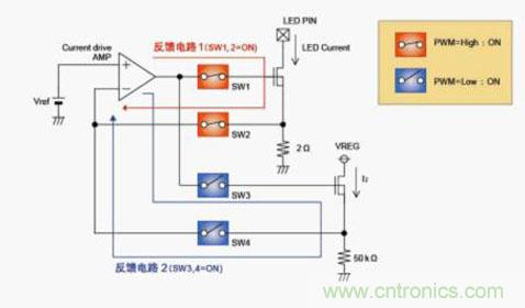 這兩條反饋通路由各SW進行切換。在PWM=High(LED為ON)區(qū)間,驅(qū)動LED電流輸出用的反饋電路(圖3反饋電路1),由LED引腳灌入LED電流。在PWM=Low(LED為OFF)區(qū)間,驅(qū)動另一條反饋電路(圖3反饋電路2),由內(nèi)部恒定電壓VREG產(chǎn)生電流。通過進行這樣的控制,LED電流雖然是關(guān)斷的,但電流驅(qū)動放大器始終處于驅(qū)動狀態(tài),PWM=Low→High時可平穩(wěn)生成LED電流。由于反饋通路2的電流I2已設(shè)定為數(shù)μA,因此,本電路結(jié)構(gòu)的功耗增加量已達(dá)到可以忽視的水平。