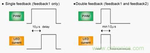 圖4為LED電流在有無與輸出不同的反饋通路時對PWM信號的跟隨性如何變化的比較數(shù)據(jù)。