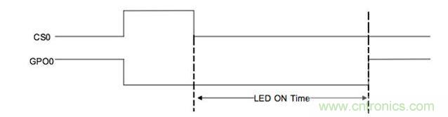 設(shè)想一下,房間燈光用機械開關(guān)控制。按下一次開關(guān),燈會打開。只要開關(guān)繼續(xù)保持這種狀態(tài),燈就會一直開著。再按一次開關(guān),燈就會熄滅。切換特性類似于這種機械切換開關(guān)。當觸摸電容式按鍵時,相應的LED燈會點亮。即便用戶手指離開按鍵,LED燈還會一直亮著。如果用戶再次觸摸按鍵,LED燈就會關(guān)閉。也就是說,在每個電容式傳感器狀態(tài)的上升沿,輸出狀態(tài)都會切換其狀態(tài),具體如下圖所示。CS0反映傳感器狀態(tài),而GPO0反映LED狀態(tài)。