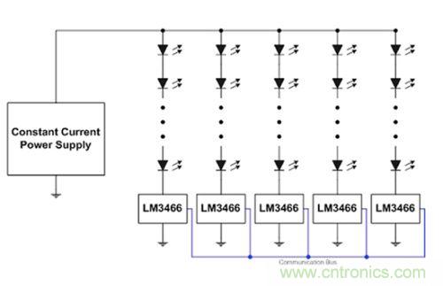 在本應(yīng)用中,LM3466 集成電路可互相通信,確保恒定電流電源所強(qiáng)加的輸入電流能夠在各串之間進(jìn)行平均分配。線性穩(wěn)壓器會(huì)吸收 LED 堆棧正向電壓的任何差異。