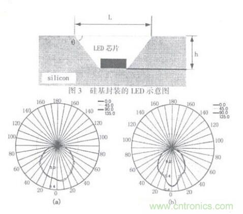 MEMS技術是隨著半導體和微電子技術的發(fā)展麗發(fā)展起來的一項新興的細微加工技術,加工尺寸從毫米到微米數(shù)量級,甚至亞微米的微小尺寸:其加T藝主要分為表面工藝和體工藝?;诠杌捏w工藝又稱為體硅工藝,體硅工藝呵以在硅基體上形成高深寬比的凹稽。由于MEMS的加工尺寸很小,因此利用該技術形成的微小凹槽作為LED芯片封裝的反射腔(如圖3),將會克服目前LED芯片直接封裝在PCB板上而引起發(fā)光效率低的問題;同時由于硅具有良好的導熱特性,因此可以降低目前封裝中熱阻高的問題,從而提高LED芯片的發(fā)光效率和可靠性。圖4(a)和(b)給出了當LED芯片直接貼裝在PCB板上和貼裝在有凹槽的硅基上的發(fā)光特性。從圈中可以看出,LED貼裝在帶有凹槽的硅基上以后其發(fā)出光的發(fā)散性能得到了很大的改善,LED的發(fā)光強度提高了75%以上。