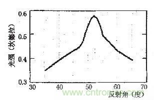 圖5為LED發(fā)射光與反射的反射角θ之間的關系,從圖中可看出當反射角為52度的時候反射光強取得最大。從理論上講,硅凹槽反射角應該設計為52度。但是,考慮到對(100)硅進行腐蝕的時候,其(111)面和(100)面會自動形成一個54.7度的角,而通過仿真分析結果可以計算。當反射角為54.7度的時候。LED的反射光強只比反射角為52度的時候小12%,而且光強分布也比較接近。因此在腐蝕凹槽的時候可以直接采用硅的(100)面和(111)面形成角度作為反射角,這可以極大的簡化加工工藝,降低制造成本,而且對LED光強的影響也不是很大。