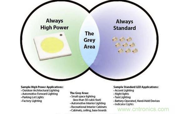 體積較小、通過電池供電或便攜式的設(shè)備(例如消費類電子產(chǎn)品、重點照明和標準指示燈等),已經(jīng)在很長一段時間內(nèi)使用了標準LED,而且有可能繼續(xù)使用。同樣,一些領(lǐng)域?qū)^續(xù)使用大功率LED技術(shù),包括:一般戶外照明、大面積的室內(nèi)照明(軌道燈、燈泡替換物)以及汽車前照燈等。