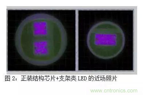 這類芯片廣泛被中低功率的封裝產(chǎn)品所采用,優(yōu)點是價格低;缺點是由于藍寶石導熱性能差,所以芯片散熱較差,P型材料的導電性也較差,因此注入電流受到限制。此外,芯片是五面發(fā)光的,通常需要將將芯片置于支架內(nèi),如圖2所示,反光杯的開口面積遠大于芯片發(fā)光面積,導致單位面積光通量低,芯片表面顏色均勻性非常差,芯片正上方偏藍,而外圈偏黃。這就是在使用中,如射燈、平板燈等,出現(xiàn)黃圈的原因。