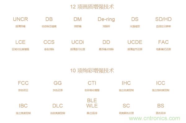 當然,它也關畫質(zhì)有那么一點事。因為大部分的電視ARM芯片也都集成了畫質(zhì)引擎技術,比如下圖所出現(xiàn)的,有百分之九十的人都不會看完的各種高大上的技術術語。不要以為這些技術很牛,是電視廠商搞出的什么新鮮玩意兒,其實這只是一個多合一芯片集成了所有的接口,也就是說只要是同一芯片方案的電視機連底層程序都是一樣的,沒有絲毫的獨特性。