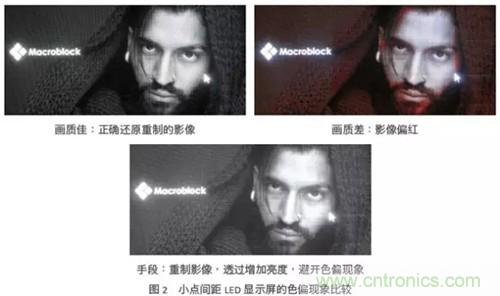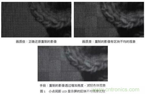 在室內(nèi)應(yīng)用中,LED顯示屏的亮度多介于300到1000尼特(nit),將此亮度轉(zhuǎn)換成LED順向電流,約當(dāng)于1~5mA,甚至小于1mA。因此,驅(qū)動芯片的小電流集中度變得很重要。當(dāng)驅(qū)動芯片電流精度不佳,小點間距LED顯示屏就容易出現(xiàn)區(qū)塊不均的色塊,然而為掩飾色塊這個缺陷,通常會采取提高LED電流這個手段,來增加顯示屏的亮度。但帶來的缺點是,當(dāng)觀眾注視這個LED顯示屏一段時間后,眼睛容易感覺不適。圖1所演示的是小點間距LED顯示屏,在使用不同質(zhì)量的LED驅(qū)動芯片時,重制圖像后的實際差異。