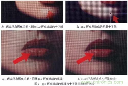 一個好的小點間距LED顯示屏必須要能消除因LED壞點所造成惱人的亮線或十字架現(xiàn)象,如圖7左圖所示。唯有采用具有“壞點隔離”功能(dead pixel isolation)的LED驅(qū)動芯片,才能維持小點間距LED顯示屏的正常運作,并可方便用戶彈性安排
