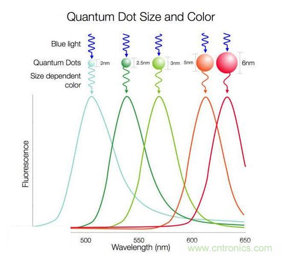 而傳說中的量子點(diǎn)顯示技術(shù)就是對背光方案做出變革:所謂的量子點(diǎn),可以簡單認(rèn)為是長寬高都在100nm以下的材料(幾個原子的大?。@種極小的半導(dǎo)體晶體在激發(fā)后可以發(fā)光,至于究竟是怎么發(fā)光的,那是科學(xué)研究范疇,這里不做討論。比較靠譜的一個結(jié)論是,量子點(diǎn)的大小,與其所發(fā)出光的能量強(qiáng)度(波長)成正比。也就是說,量子點(diǎn)的直徑越小,激發(fā)后的光波長越短,也就是顏色偏藍(lán),直徑越大則激發(fā)后的光波長越長,也就是顏色偏紅。