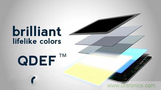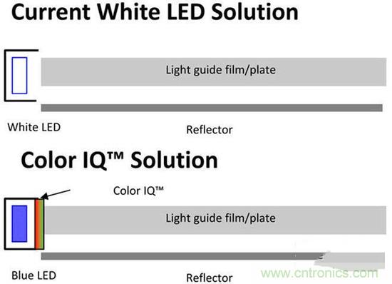 (QDEF方案則是在藍(lán)色LED上方,用上一整片布滿紅色與綠色量子點(diǎn)的