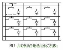 而第三種“半有源”驅(qū)動雖然可以較好地避免像素之間的串?dāng)_現(xiàn)象,但是由于其像素電路中沒有存儲電容,并且每一列的驅(qū)動電流信號需要單獨調(diào)制,并不能完全達到上面列出的有源選址驅(qū)動方式的全部優(yōu)勢。