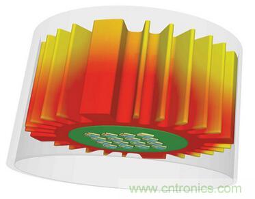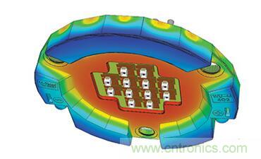 LED燈具設(shè)計(jì)師所面臨的挑戰(zhàn)是如何將所有這些東西都放在可用的空間中,同時確保成品內(nèi)部和外部關(guān)鍵點(diǎn)的溫度保持在可接受的范圍內(nèi)。這時候,熱模擬就能起到作用,特別是在整個設(shè)計(jì)過程中。圖2示出了在熱模擬下有良好散熱的芯片模塊范例。