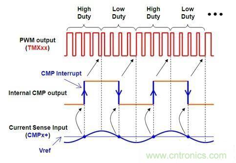 對于開關(guān)電源,PWM占空比決定輸出電壓,如圖3,電路開始工作后,LED電流經(jīng)采樣后加到MCU內(nèi)置比較器端口,和參考值進行比較,產(chǎn)生中斷信號,來調(diào)整PWM的占空比,其變化過程見圖4,如當電流大于參考值時,降低占空比;反之,提高占空比,最終達到一個負載電流動態(tài)穩(wěn)定的狀態(tài)。