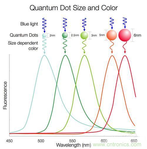 簡單通俗的說,量子點的光電性質與以往的發(fā)光顯示顆粒大不一樣,量子點因為顆粒非常小,以納米為單位,導致量子點的顯示顏色是以改變顆粒的大小形狀而進行改變,也正因為如此,理論上來講,量子點顯示的色譜更具有連續(xù)性,成本也會更低。