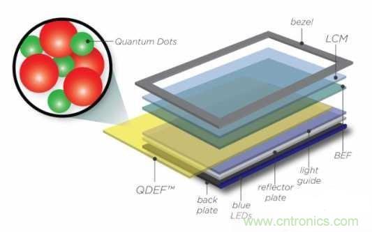 但如果是通過量子點進行顯色的話,就不需要進行白光背光,原因有兩個(其實算起來應該算一個):光致發(fā)光的原因,藍光量子點無法登場,所以在背光中必須加入藍色光源,其二,是因為目前的量子點只負責產生綠光和紅光,所以必須將原背光模組中的白光LED換成藍光LED。