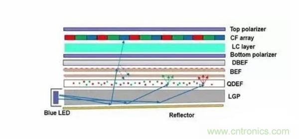 與此同時,QDEF層連擺放位置很計較,為了讓光在層層光學膜中旅行時,重復反射通過QDEF的次數(shù)增多,所以QDEF還得放在離光源最近的地方,一但順序往上移,紅綠光的轉換不足,就會造成偏藍的現(xiàn)象。