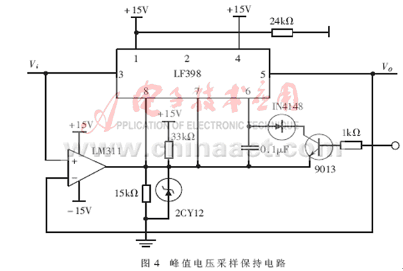 峰值電壓采樣保持電路如圖4所示。峰值電壓采樣保持電路由一片采樣保持器芯片LF398和一塊電壓比較器LM311構(gòu)成。LF398的輸出電壓和輸入電壓通過LM311進(jìn)行比較,當(dāng)Vi>V0時(shí),LM311輸出高電平,送到LF398的邏輯控制端8腳,使LF398處于采樣狀態(tài);當(dāng)Vi達(dá)到峰值而下降時(shí),Vi<V0,電壓比較器LM311輸出低電平,LF398的邏輯控制端置低電平,使LF398處于保持狀態(tài)。由于LM311采用集電極開路輸出,故需接上拉電阻。由過電壓檢測電路輸出端送來的脈沖控制電子開關(guān)的導(dǎo)通,沒有過電壓時(shí)采樣電容放電,否則采樣電路一直跟蹤峰值的變化。