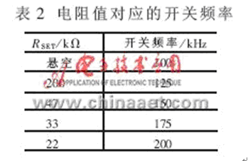 開關(guān)頻率可以通過外接電阻RSET在100kHz~200kHz之間調(diào)整,這個特點可以讓使用者根據(jù)工作頻率優(yōu)化磁存儲器以及電容器的尺寸、型號等。表2為不同的電阻值對應(yīng)的常用開關(guān)頻率。