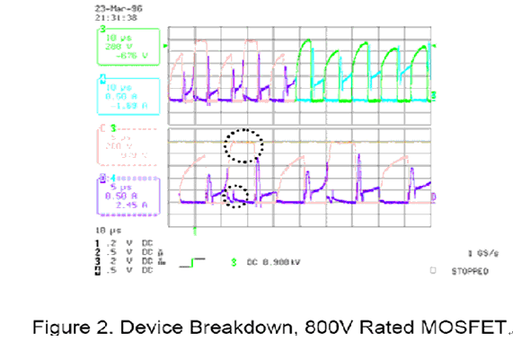 當場效應晶體管進入崩潰效應時 Drain 及 Source 電壓會被嵌制在其崩潰電壓 , 而電流會經由寄生的二極管而產生逆向操作電流的現(xiàn)象。如圖二所示為一典型開關式電源電路所量測到的崩潰現(xiàn)象。從圖中可看出 Drain 及 Source 的電壓 (CH3) 被箝制在 1KV 而且逆向電流 (CH4) 可清楚地被發(fā)現(xiàn)。