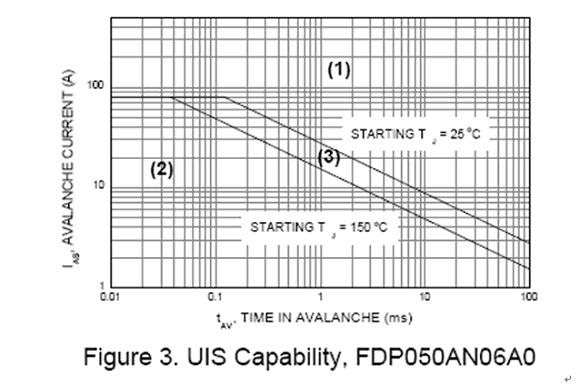 UIS 的評估方式是針對崩潰現(xiàn)象分析的一種很有用的方法。在圖三 UIS 安全工作區(qū)域中可區(qū)分為三大區(qū)域 (1) 大于 25 ° C 線或者是圖中靠右的區(qū)域 , (2) 低于 150 ° C線或者是圖中靠左的區(qū)域 , (3) 介于 (1) 與 (2) 的區(qū)域。其中 (1) 可清楚地了解此組件工作超出額定工作范圍之外 (2) 則是位于額定工作范圍之內。至于 (3) 的區(qū)域界定 我們需要得到此組件的起始 UIS 接合面溫度以決定其工作能力。稍后會在后面舉例說明如何求出此接合面溫度。