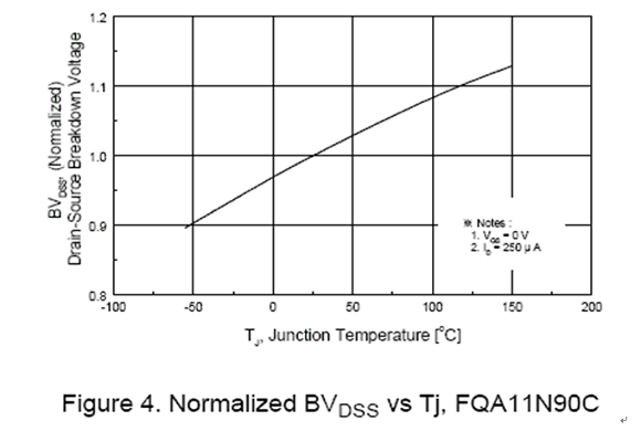 一般而言 假使 Drain 及 Source 電壓超過規(guī)格書所載明的最大額定電壓稍大一些 , 此時要讓場效應晶體管產生崩潰現(xiàn)象其實是不常發(fā)生的。圖四所表示的曲線為場效應晶體管的額定最大工作電壓 (BVDSS) vs 接合面溫度 (Tj), 其特性的表示是以正溫度特性變化 。當接合面溫度達到 120 ° C 時 , BVDSS 可達到將近 990V 。由此可知 , 在更高的接合面溫度條件下 , 場效應晶體管需要更高的 Drain 對 Source 的電壓以達到崩潰效應產生的必要條件。