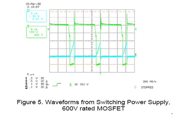 但這里必須提醒一件事 , 圖四所標示的 BVDSS 是基于 250uA 的 ID 電流為條件所定義。在實際崩潰發(fā)生時 ID 電流遠大于 uA 的范圍。 因此 , 所欲達到的崩潰電壓也會比上述圖四中所推導的電壓要來的大的多。就實際的考量而言 , 場效應晶體管的實際崩潰電壓一般是額定低電流崩潰電壓的 1.3 倍。以圖五為例 , 它所表示的是一個超過最大額定電壓但并未進入崩潰現(xiàn)象的波形 ,Drain-Source 的電壓已達到 668V > 600V 但并未嵌制于崩潰效應。