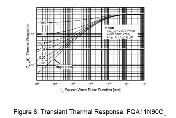 舉例說明 , 當一個 2KW 的電源脈沖加至 FQA11N90 的脈沖時間為 1uS 時 , 我們可依據(jù)圖六的曲線算出此脈沖功率對接合面所產生的溫升為