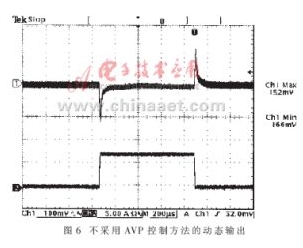 本文通過檢測(cè)輸出電感電阻的阻值,對(duì)其進(jìn)行適當(dāng)?shù)奶幚?,有效地?shí)現(xiàn)AVP控制(如圖5所示),避免了在電感與輸出端增加電阻所引起的效率下降問題。圖5(b)和圖6為采用AVP控制方法和不采用AVP控制方法兩種情況下的實(shí)測(cè)動(dòng)態(tài)波形。輸出電流由空載到半載(0→7.5A)時(shí)測(cè)得輸出電壓峰-峰值為97mV,而不采用AVP控制方法時(shí)輸出電壓峰-峰值為318mV。而且圖5(b)的動(dòng)態(tài)恢復(fù)時(shí)間明顯比圖6的恢復(fù)時(shí)間短??梢?,采取AVP控制有著良好的動(dòng)態(tài)響應(yīng),進(jìn)而可減小輸出電容及降低成本。