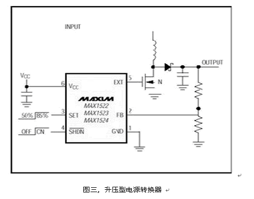 有些設(shè)計(jì)者為了追求較高的轉(zhuǎn)換效率, 選擇了升壓方式,產(chǎn)生一組高于輸入的穩(wěn)定輸出, 如圖三的升壓架構(gòu)。由于功率開(kāi)關(guān)MOSFET是外置的, 可提供較大的輸出功率。在輸出功率許可的條件下,也可以選擇內(nèi)置MOSFET功率開(kāi)關(guān)的升壓轉(zhuǎn)換器,如MAX1722, 可有效節(jié)省空間、降低成本。