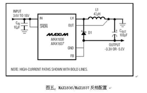 也可以選擇負(fù)電壓輸出轉(zhuǎn)換器, 圖六便是常用的PWM負(fù)壓轉(zhuǎn)換器, 外部元件少、設(shè)計(jì)簡(jiǎn)易, 工作在固定頻率的PWM結(jié)構(gòu)干擾較小。