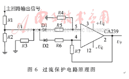 過電流保護(hù)電路的主要任務(wù)是檢測輸出電流的變化,并將其反饋到SG3525的控制端,在電流較大時(shí)可可靠關(guān)斷系統(tǒng),以避免器件的損壞。其電路原理如圖6所示。圖中,電阻R1、R2對主電路的輸出進(jìn)行采樣,當(dāng)輸出電路中電流增大到設(shè)定值時(shí),采樣電壓U1隨之增大,該信號經(jīng)CA239反饋到SG3525的+V端,封鎖PWM脈沖。