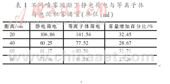 由表1可以看出,由于使用了等離子體荷電噴霧技術(shù),農(nóng)藥落在植株上的藥量有了明顯的增加,達(dá)到了設(shè)計(jì)要求。由表2可見,等離子體荷電與普通靜電噴霧相比,能在較小的放電電壓下得到較高的荷質(zhì)比。從而降低了農(nóng)藥的使用量,也減輕了對環(huán)境的污染。