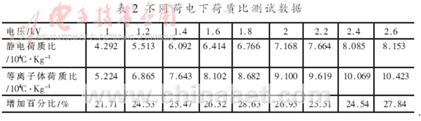 荷質(zhì)比是衡量霧滴荷電性能的重要指標(biāo),荷質(zhì)比越大,霧滴的荷電性能及充電效果越好,通過實(shí)驗(yàn)手段可對霧滴荷電情況進(jìn)行測量。不同荷電情況下荷質(zhì)比測試數(shù)據(jù)如表2所示。